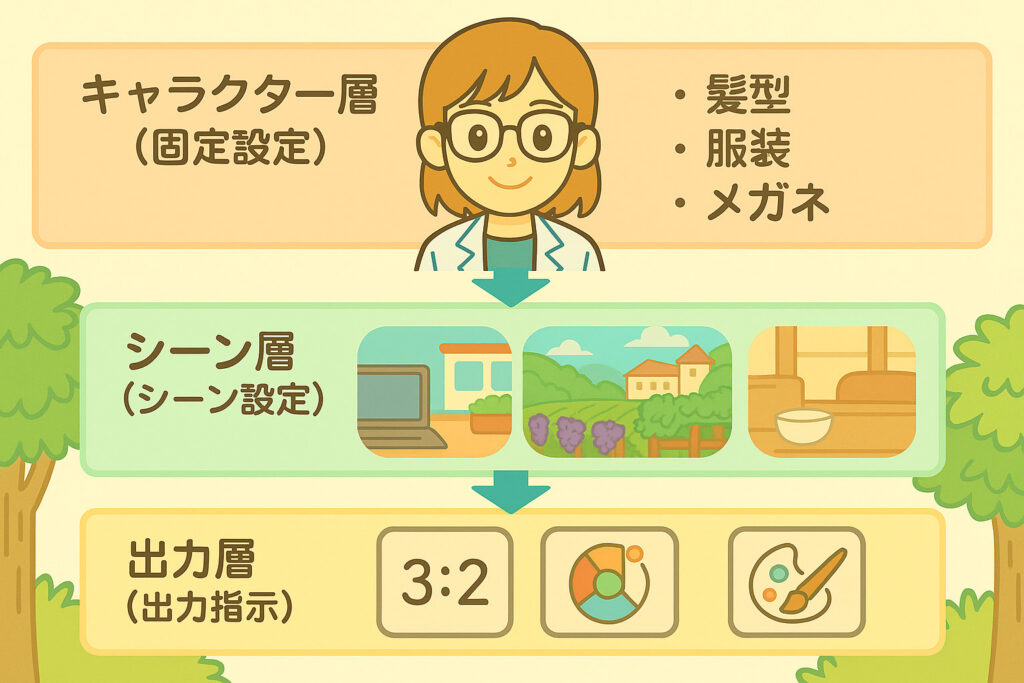 3層構成とは、プロンプトを、キャラ層/シーン層/出力層の3つに分けて構成することです。