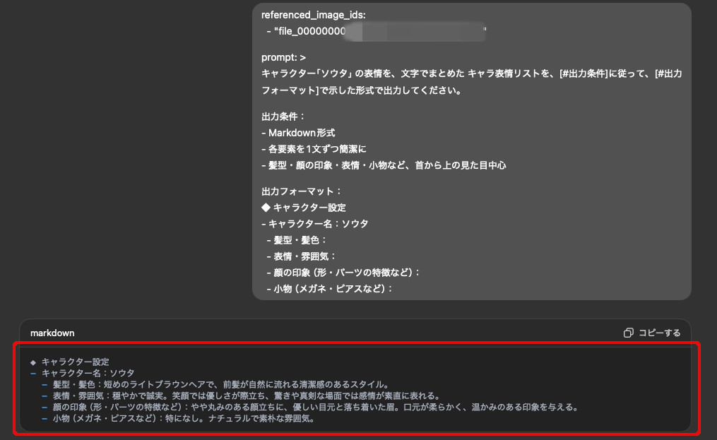 キャラ名「ソウタ」の表情リストを作成するプロンプト実行例。見た目要素を整理しておく