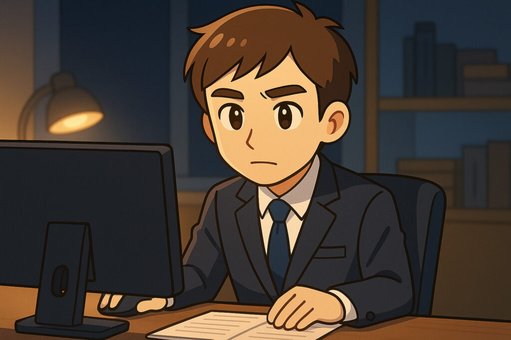 夜のオフィス。ソウタがモニターを見つめながら資料を確認している。