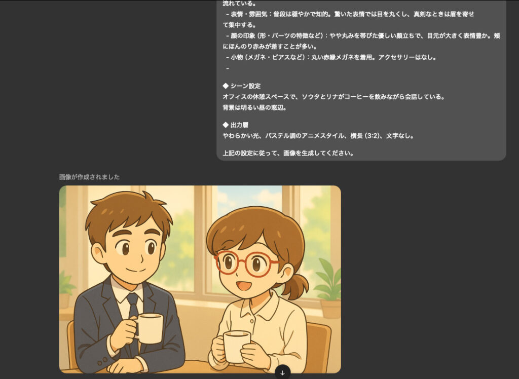 「キャラ1:ソウタ」「キャラ2:リナ」と指定しておくと、AIが混同せず安定して描けます。
