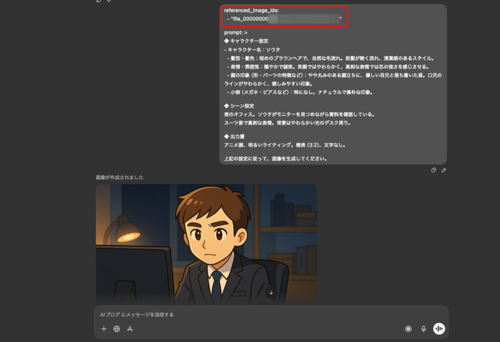 そのため、キャラの表情シートを参照するときは、適宜キャラの表情シート(画像)を再アップして、ファイルIDを再取得し、プロンプト内のファイルIDを更新してください。