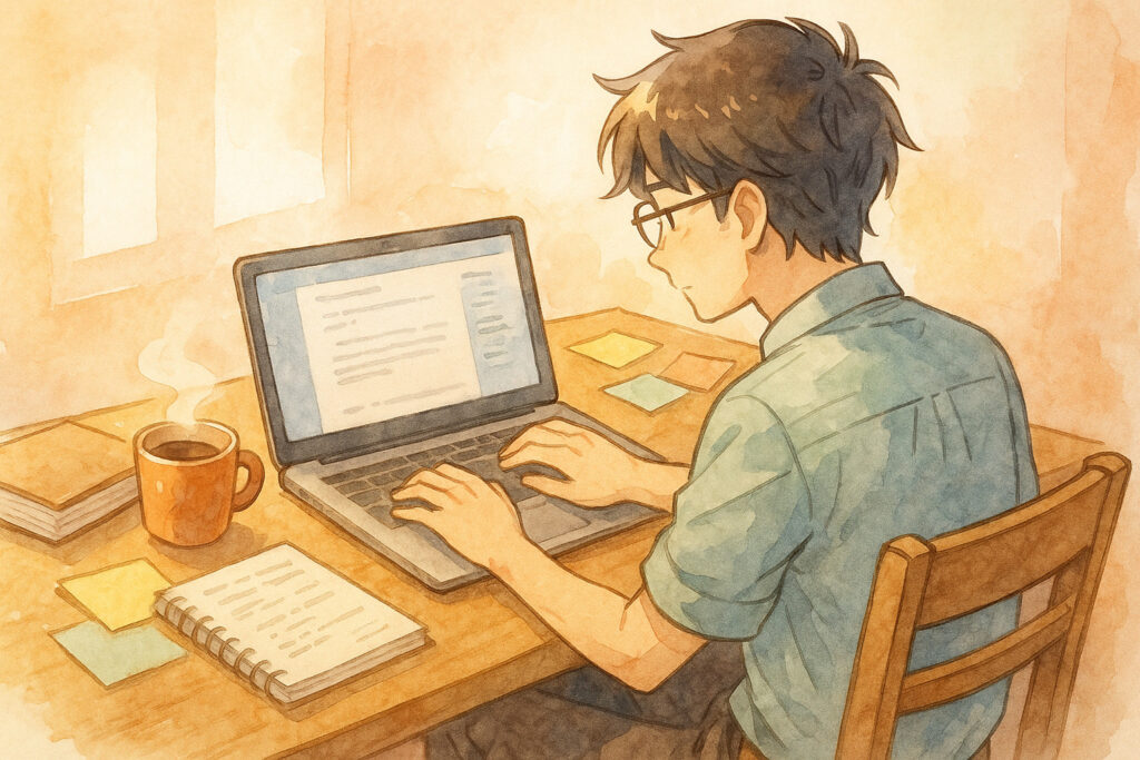 A soft watercolor anime-style illustration showing a researcher writing a blog article at night. Warm light, calm mood, horizontal (2:3), no text.