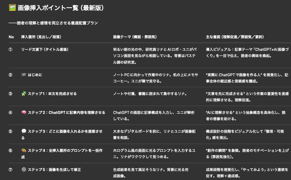 ChatGPTは見出し単位で「ここは図解」「ここは雰囲気カット」等を提案してくれます。