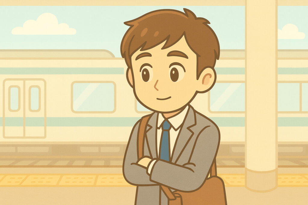 添付の「キャラ名+表情シート」を参考に、ソウタが、朝、ホームで、電車を待っているシーンを作成してください。