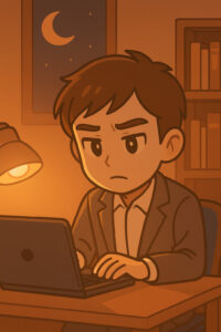 • 変更前:夜にブログ記事を書いている研究員。柔らかな水彩アニメ風。温かい光、落ち着いた雰囲気。縦長(2:3)、文字なし。
