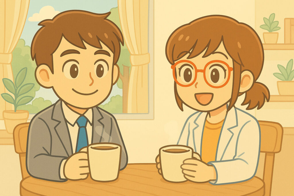 添付の「ソウタ表情シート」と「リナ表情シート」を参考に、ソウタリナが昼休みにカフェでくつろいでいるシーンを作成してください。