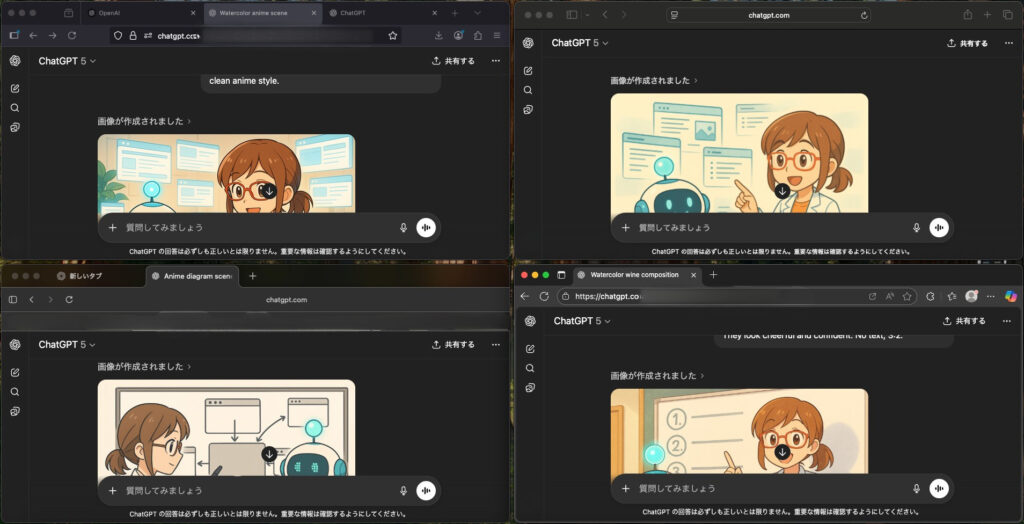 - 各ウィンドウで同じ画像生成プロンプトを実行